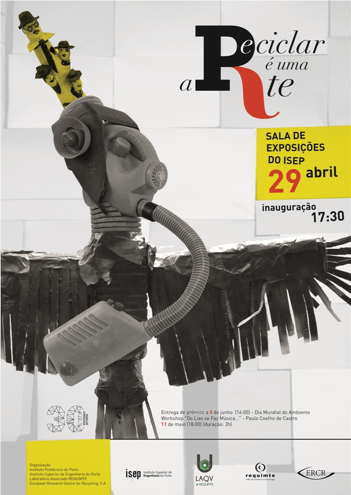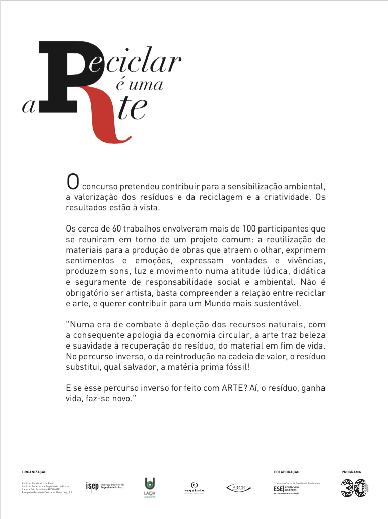 O Instituto Politécnico do Porto (IPP), o Instituto Superior de Engenharia do Porto (ISEP), o Laboratório Associado REQUIMTE e o European Research Centre for Recycling, S.A. (ERCR), promoveram o concurso "Reciclar é uma Arte". O concurso pretendeu contribuir para a sensibilização ambiental, a valorização dos resíduos e da reciclagem e a criatividade. Os resultados estão à vista! Os cerca de 60 trabalhos envolveram mais de 100 participantes que se reuniram em torno de um projeto comum: a reutilização de materiais para a produção de obras que atraem o olhar, exprimem sentimentos e emoções, expressam vontades e vivências, produzem sons, luz e movimento numa atitude lúdica, didática e seguramente de responsabilidade social e ambiental. Não é obrigatório ser artista, basta compreender a relação entre reciclar e arte, e querer contribuir para um Mundo mais sustentável. Download do catálogo da exposição. Artigo no Jornal "Quercus Ambiente". |